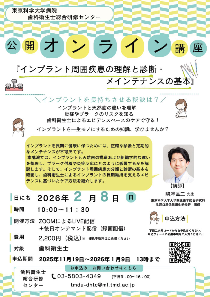 2025年度 公開オンライン講座 2025.11.17 2026年2月8日(日)10:00~11:30 ZOOMによるLIVE配信 申込フォーム お問い合わせ先 東京科学大学病院 歯科衛生士総合研修センター TEL.03-5803-4349(受付時間:9:00~17:00(月・火・木・金 )) FAX.03-5803-0405 Mail:tmdu-dhtc@ml.tmd.ac.jp